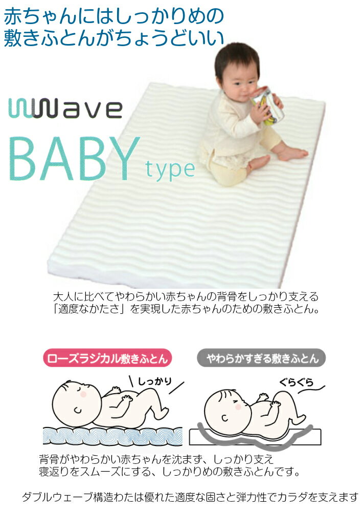 ギフト対応 ローズラジカル敷きふとん ベビータイプサイズ70(幅)×120(丈)×5.5(厚)cm材質 側地:綿100%(表部分:キルティング加工)詰めもの:ポリエステル100%(ウェーブ固わた) 2.2kg色白 商品説明 赤ちゃんの成長を応援するローズラジカル敷きふとん ベビータイプはウェーブ構造の新時代敷きふとん。