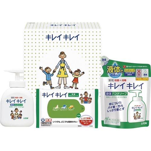 ●ハコ:約19.7×5.8×17.7cm ●重量=約650g ●キレイキレイ薬用ハンドソープ250ml・ キレイキレイ薬用ハンドソープ詰替え200ml・ キレイキレイ除菌ウェットシート(アルコールタイプ)10枚×各1 ※パッケージ等、変わる場合がございます(商品内容は変わりません)。
