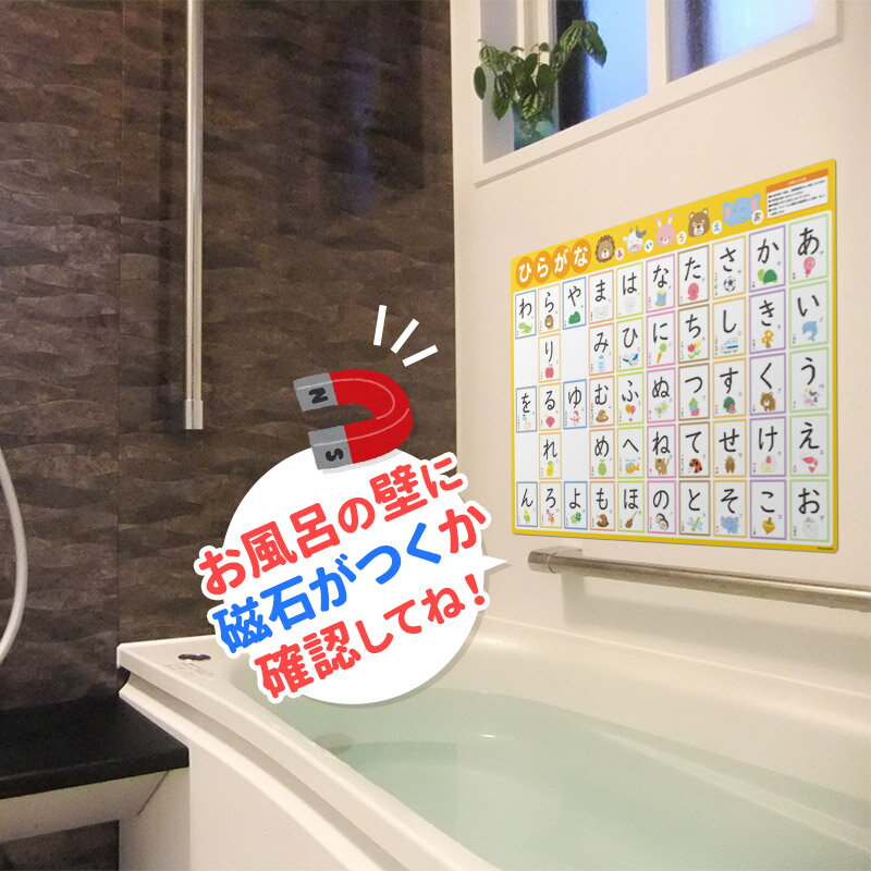 お風呂に貼ってひらがなを学習できるマグネット製ポスターです。